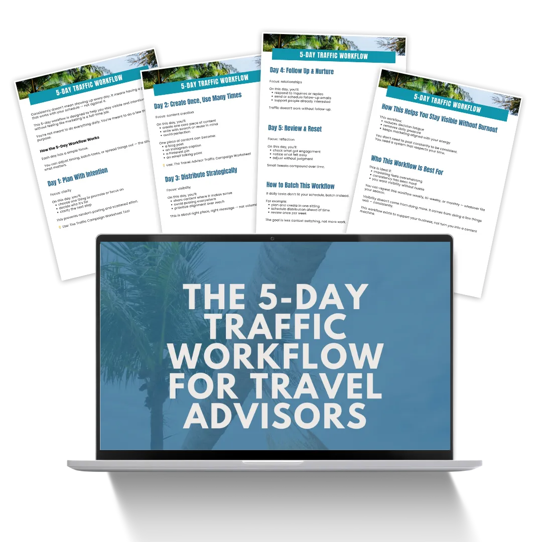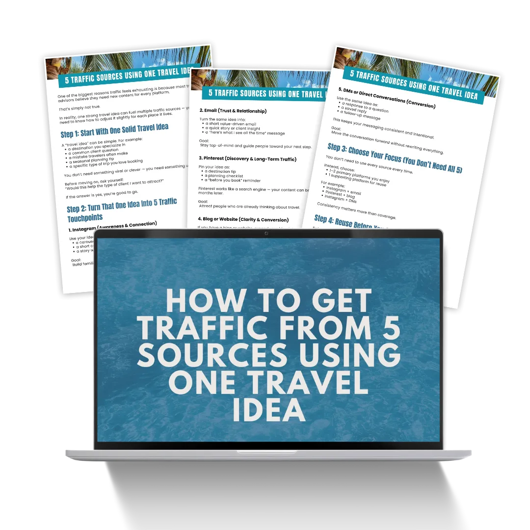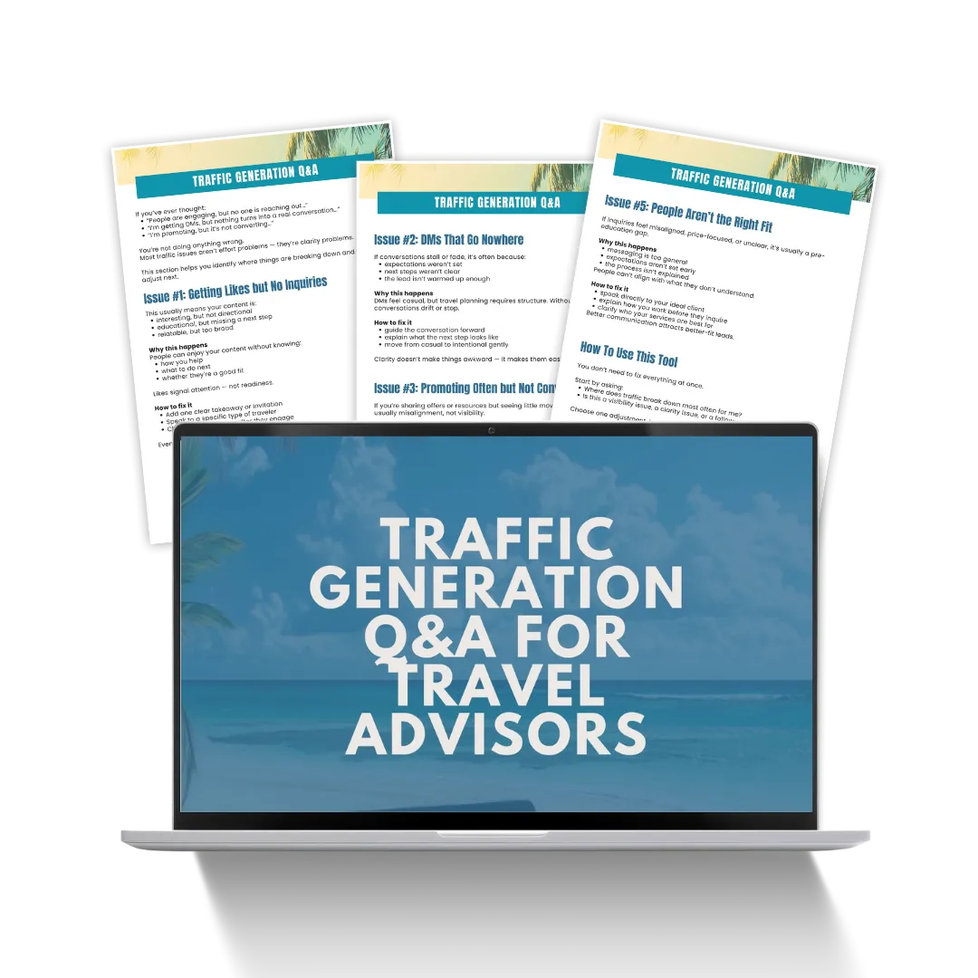 This 11-piece toolkit gives you clear traffic strategies designed specifically for travel advisors — so you can attract better-fit inquiries without daily posting, overwhelm, or complicated funnels.