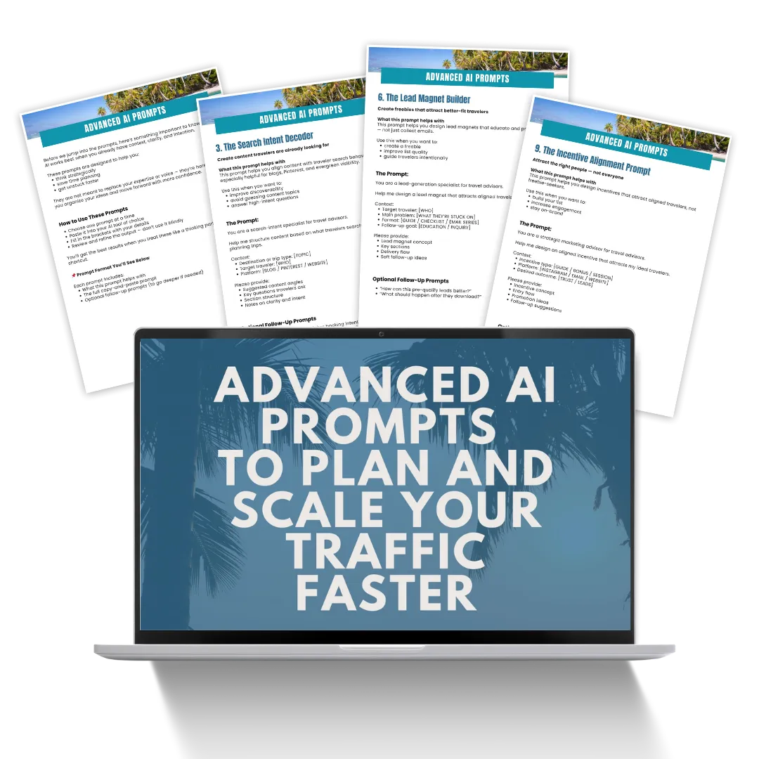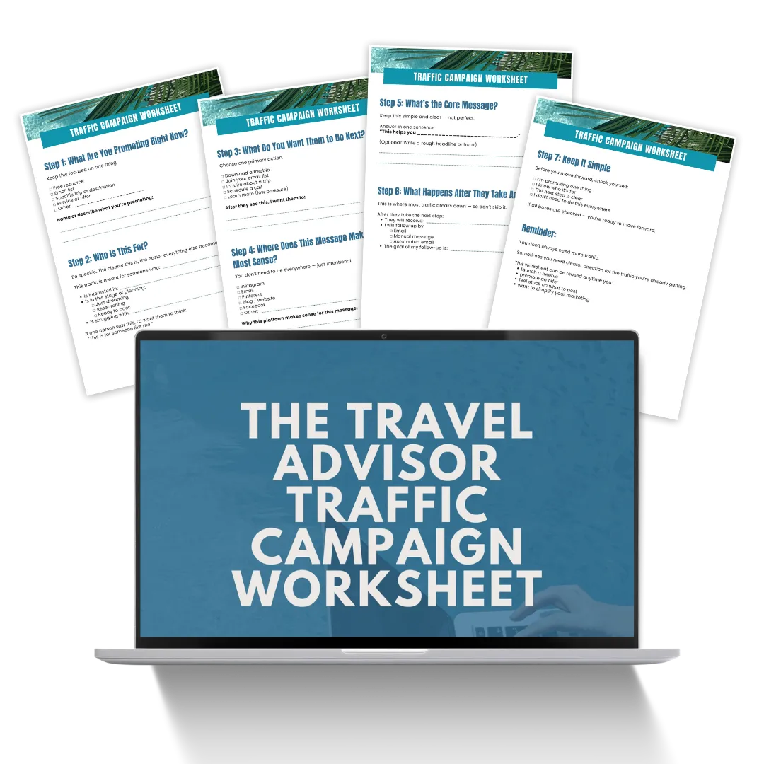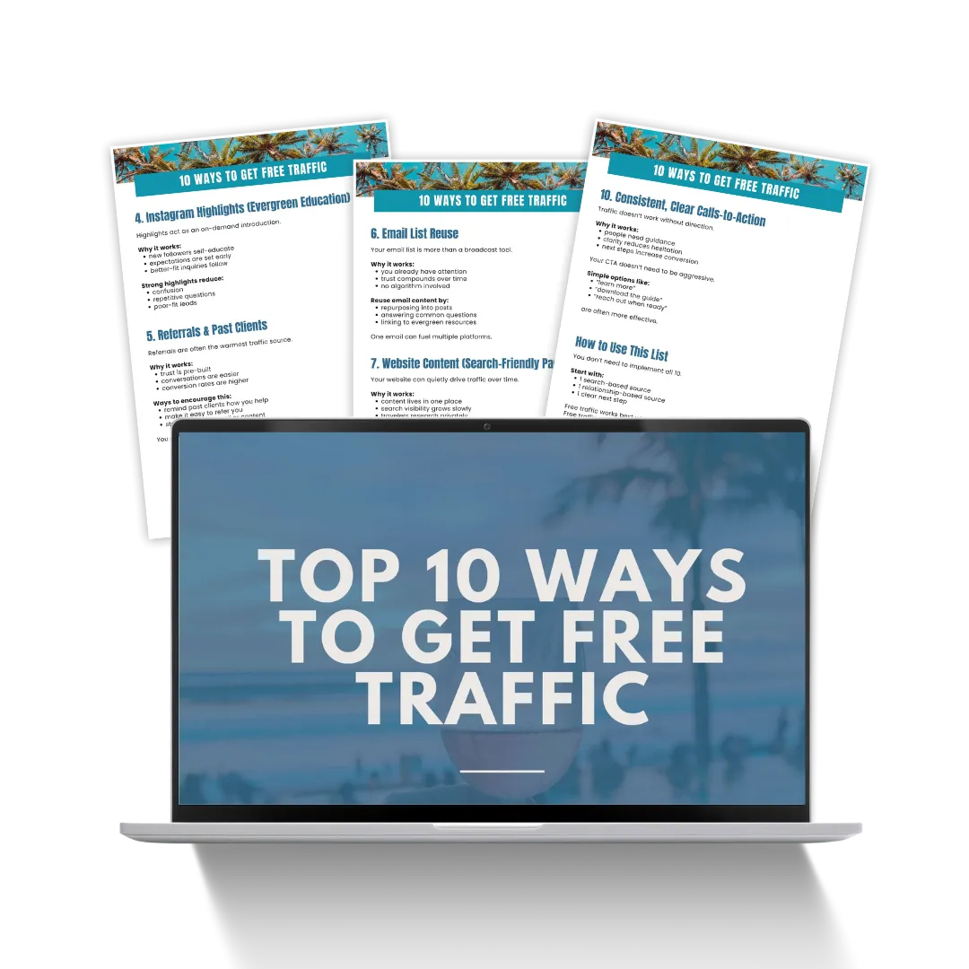 This 11-piece toolkit gives you clear traffic strategies designed specifically for travel advisors — so you can attract better-fit inquiries without daily posting, overwhelm, or complicated funnels.