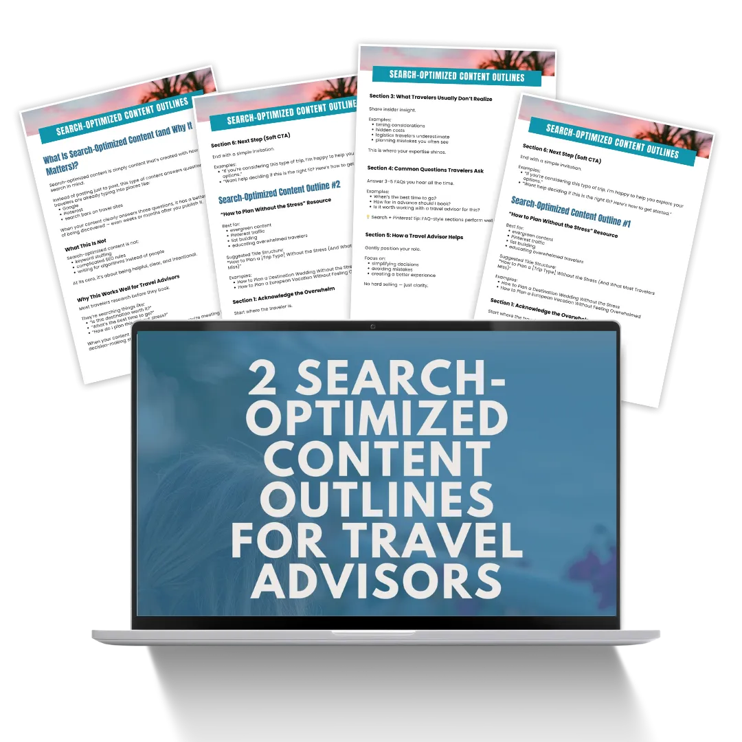 Two proven content outlines designed to help travel advisors get discovered organically through search and Pinterest without needing to be an SEO expert.